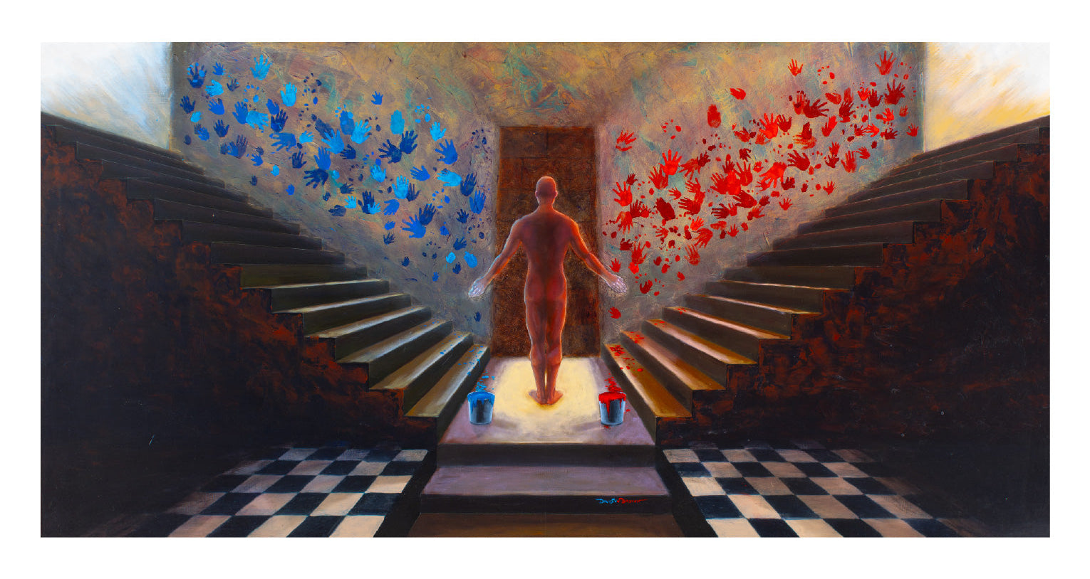 With this piece, I put oil to board to represent the symbolic journey through life, encouraging us to choose, with a visible door ahead encouraging us to trail blaze forward on our own path and the pressure to choose what others have chosen.